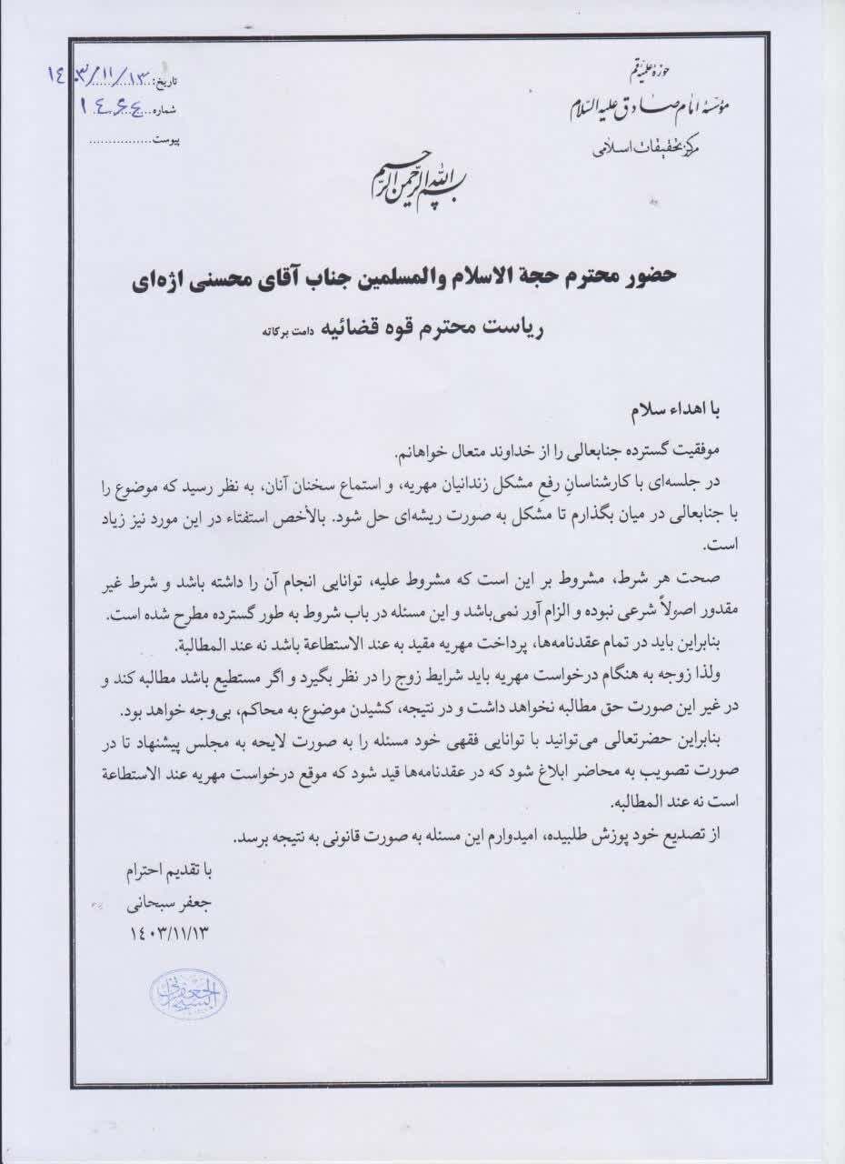 به گزارش خبرگزاری مهر، دفتر حضرت آیت الله سبحانی نوشت: «این نامه با هدف تبیین برخی از چالشهای موجود در اجرای احکام مرتبط با مهریه و ارائه پیشنهادهایی برای اصلاح و بهبود روندهای قانونی تنظیم شده است.